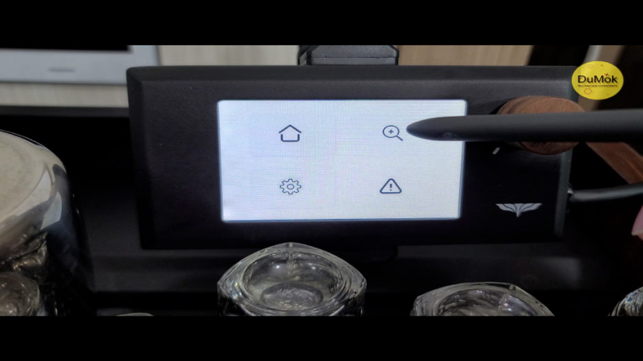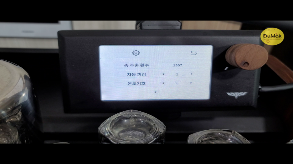 톱니바퀴 버튼은 설정 버튼입니다. 총추출 횟수를 확인할 수 있고 사용하지 않을 때 자동 꺼짐 기능과 온도 표시 단위를 변경할 수 있으며 자동 청소 반복 횟수를 지정할 수 있습니다.