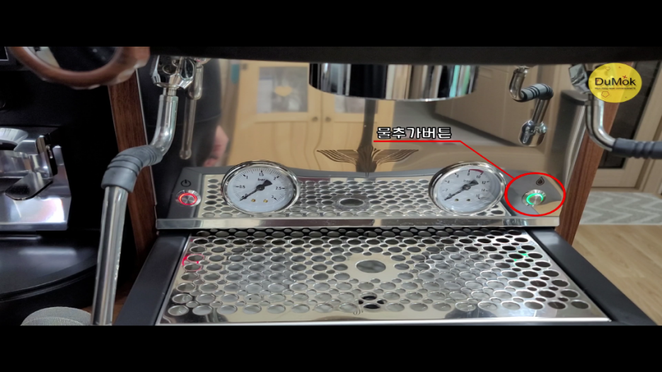 추출전 물 추가로 인해 원두에 뜸을 들이는 역활을 하기도 하며 추출 후 물을 추가하기도 하지만 샤워스크린에 붙은 원두 찌꺼기를 제거할때 사용하기도 합니다.